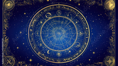 Celestial Zodiac Chart, Astrology, Night Sky, Golden Design, Mystical Background, Horoscope, Website, App