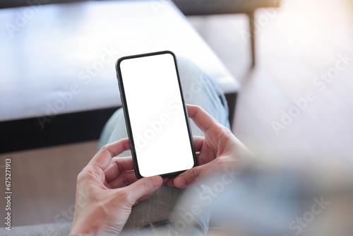 cell phone blank white screen mockup.hand holding texting using mobile on desk at office.background empty space for advertise.work people contact marketing business,technology