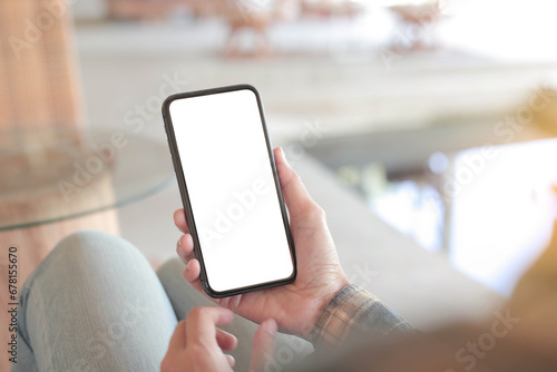 cell phone blank white screen mockup.hand holding texting using mobile on desk at office.background empty space for advertise.work people contact marketing business,technology