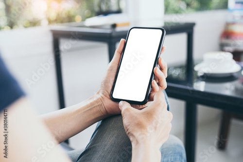 cell phone mockup blank white screen.woman hand holding texting using mobile on desk at coffee shop.background empty space for advertise.work people contact marketing business,technology