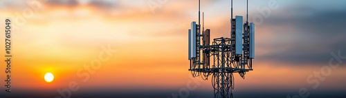 Cellular tower equipped with 5G antennas and radio modules, telecommunication innovation, sunset sky, modern network technology, future of communication