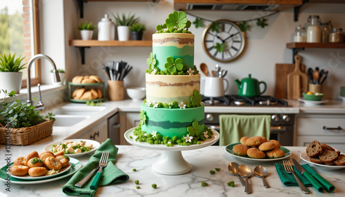 Celtic-themed cake display in expansive kitchen, St. Patrick's Day celebration