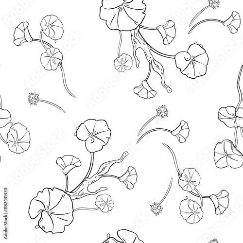 Centella asiatica stems and rounded leaves black white vector seamless pattern. Geranium, pennywort herbal plants hand drawn. Greenery design on repeating background for package, textile, texture.