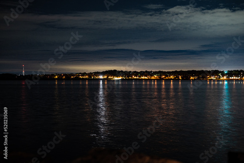 centennial beach barrie at night time building lights boat yard all in view