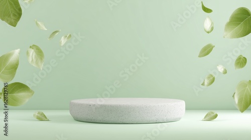 Centered Stone Podium with Floating Green Leaves – Pastel Green Background with Wide Clean Copy Space for Branding