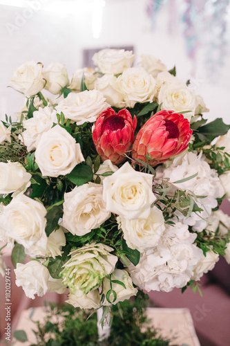 Centerpiece made of stunning white roses stands on a little square dinner table