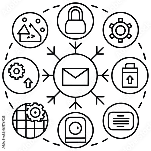 Central envelope with surrounding icons of security and data flow email message