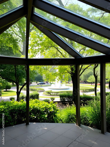Central Park view from a modern pavilion showcasing greenery and a fountain in the distance.
