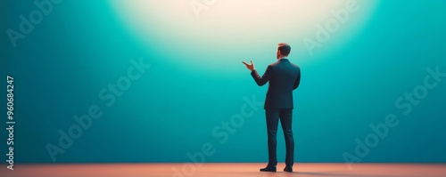 CEO speech, inspiring executive on stage, corporate conference, 3D illustration