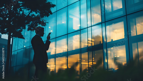 Ceo standing glass wall evening building talking cellphone. Executive calling