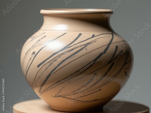 ceramic beige light vase with design on it sits on table. Vase is empty and has simple, elegant design. Concept of calm and serenity