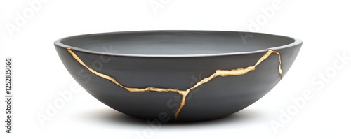 ceramic bowl with gold kintsugi repair on white background, japanese art and craftsmanship concept