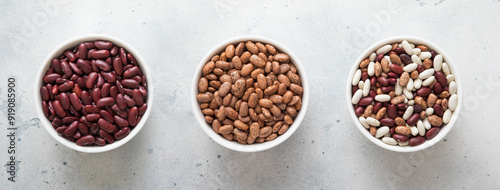 Ceramic bowls with red and variegated and mixed raw dry beans on kitchen table.Macro.