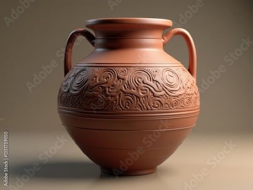 ceramic Brown vase with design on it sits on table. Vase is empty and has simple, elegant design. Concept of calm and serenity