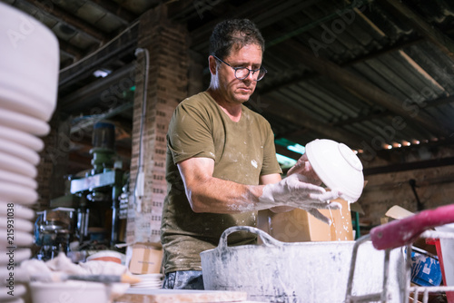 Ceramic dishes in working process. Creating ceramic pieces. Tradicional ceramic factory in spain