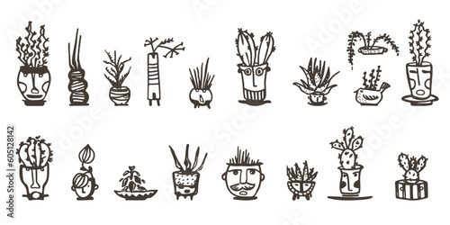 Ceramic pots with cactus comic faces. Black doodle emotions characters. Plant ceramics. Pottery vases trendy concept. Cartoon style. Hand drawn illustration isolated on white background Vector set