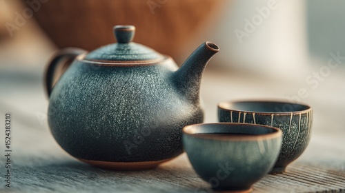 Ceramic Teapot and Cups on Wooden Table, Representing Tranquility and Wellness in Lifestyle Photography for Relaxation and Mindfulness Content : Generative AI