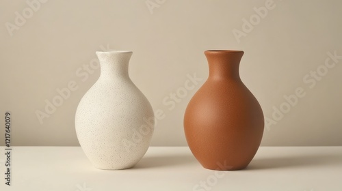 Ceramic vases in white and terracotta color against a soft neutral background with Copy Space for text placement