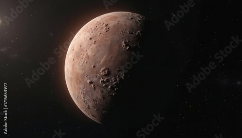 Ceres planet 3D render. Rocky surface, craters, distant star light illuminates one side. Dark cosmos background with tiny stars. Space exploration, astronomy science concept.