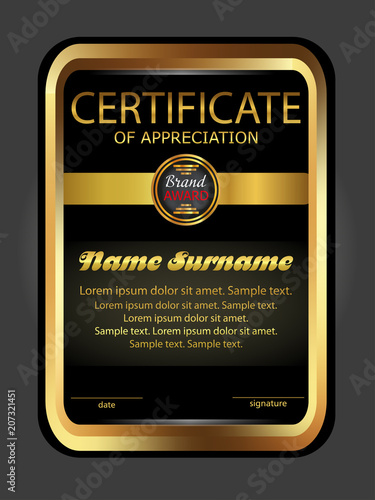 Certificate appreciation vertical template. Winning the competition. Black background with gold decorative elements. Vector
