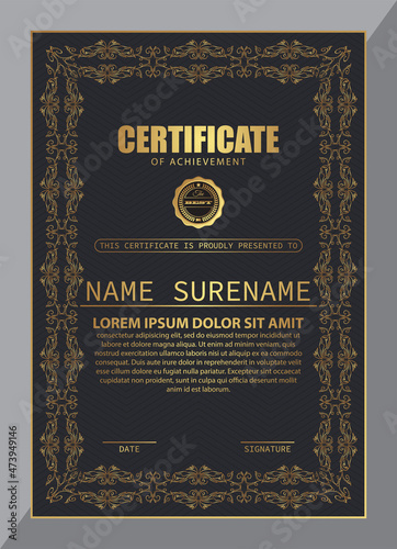 Certificate Design. Diploma currency border template. Dark colored gift voucher award background