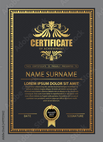Certificate Design. Diploma currency border template. Dark colored gift voucher award background.