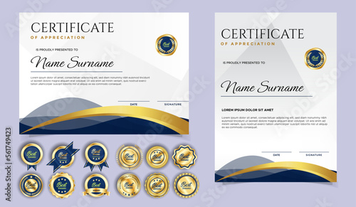 Certificate of appreciation template, gold and blue color. Clean modern certificate with gold badge. Certificate border template with luxury and modern line pattern. Diploma vector template