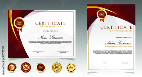 Certificate of appreciation template, gold and red color. Clean modern certificate with gold badge. Certificate border template with luxury and modern line pattern. Diploma vector template