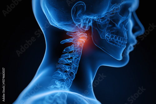 Cervical spine highlighted with red pain area in human neck x ray view showing vertebrae and skull anatomy in medical concept