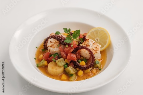 Ceviche featuring octopus and corvina served with yam, sweet potato, Peruvian corn, and tiger's milk sauce