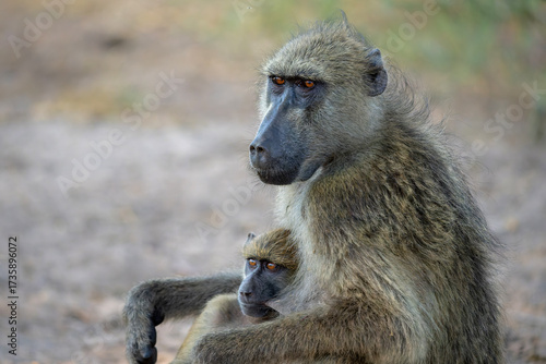 Chacma baboons (Papio ursinus), also known as the Cape baboon, hanging around in Chobe National Park in Botswana