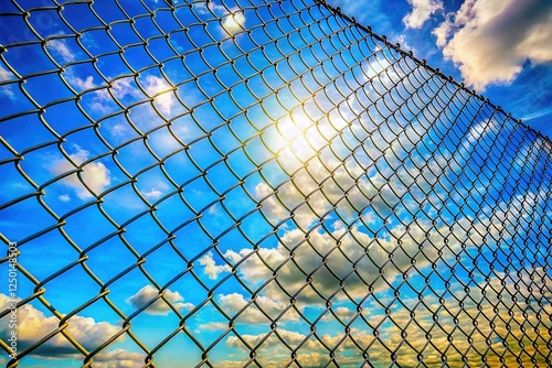 Chain Link Fence Against a Vibrant Blue Sky with Clouds - Stock Photo