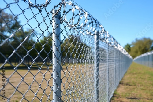 Chain link fence with barbed wire surrounding an open field on a clear day
