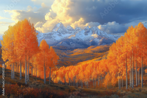 Chaîne de montagnes automnales, lever du soleil, lumière dorée, sommets illuminés