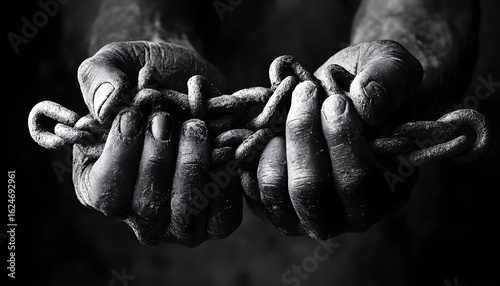 Chains of oppression: slavery roots, trade horrors, racism rise, captive lives, ownership wrong, enforced labor, freedom denied, social injustice, racial divide, exploited souls, historical burden