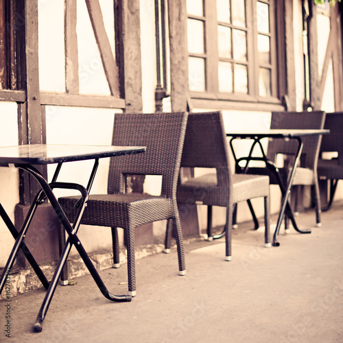 Chairs and tables of an outdoors cafe in Paris