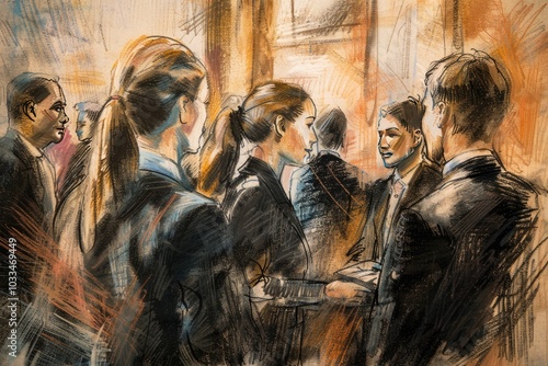 chalk drawing of smiling woman business people enjoying bouquet of flowers, standing in a sunny park. Earth tones, relaxed pose