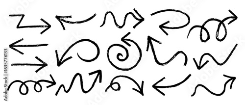 Chalk or charcoal rustic dirty grunge doodle line arrow vector illustration set. Hand drawn bold charcoal or crayon curve rough doodle arrow design element collection.