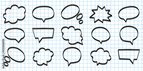 Chalk pencil speech bubbles doodle set. Communication frames, talk balloons in sketch style.