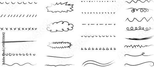Chalk scribble doodle arrow, line elements set. Crayon arrow, underline, handwritten mark check. Rough hand drawn marker sketch with brush grunge texture. Hand drawn doodle brush lines vector image.