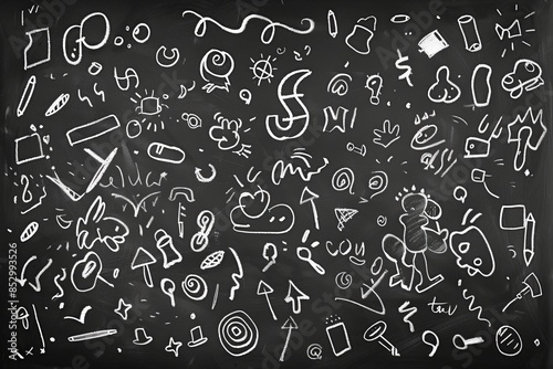 Chalkboard style scribbles and doodles in white on black