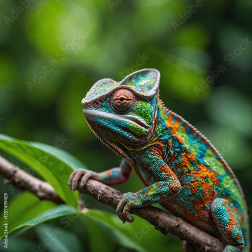 Chameleon Blending with a Bright Green Leaf