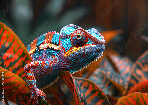 Chameleon's Kaleidoscope, a brightly colored chameleon, its scales a stunning display of colors as it blends with the surrounding foliage.
