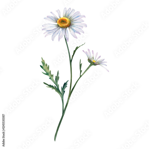 Chamomile flower. Watercolor illustration of a daisy hand-painted. Botanical painting of pharmacy flowers. A bouquet of white wildflowers on an isolated background. Clipart for postcards.