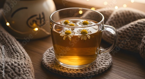chamomile tea prepared in a clear glass mug, with dried chamomile flowers floating on the surface, placed on a coaster.