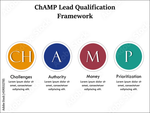 ChAMP - Challenges, Authority, Money, Prioritization. ChAMP Lead Qualification Framework. Infographic template with icons and description placeholder