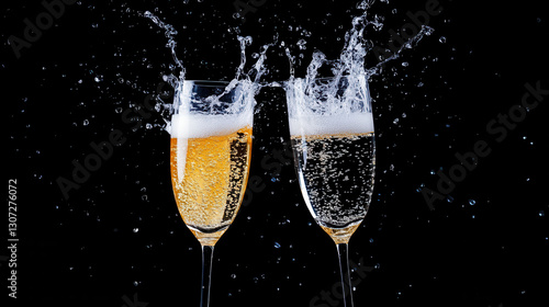 Champagne being poured into crystal flutes with splash effect, celebration