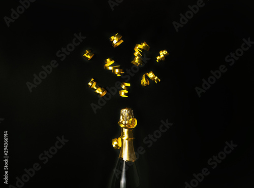 Champagne bottle with golden party streamers on black background. Flat lay style. Celebration concept.