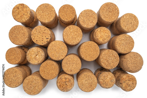 Champagne corks isolated on white background. 25 corks of champagne close-up. Champagne wine corks texture background. High quality photo.
