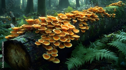 Champagne Cup Mushrooms Growing on Fallen Log in Lush Forest Undergrowth